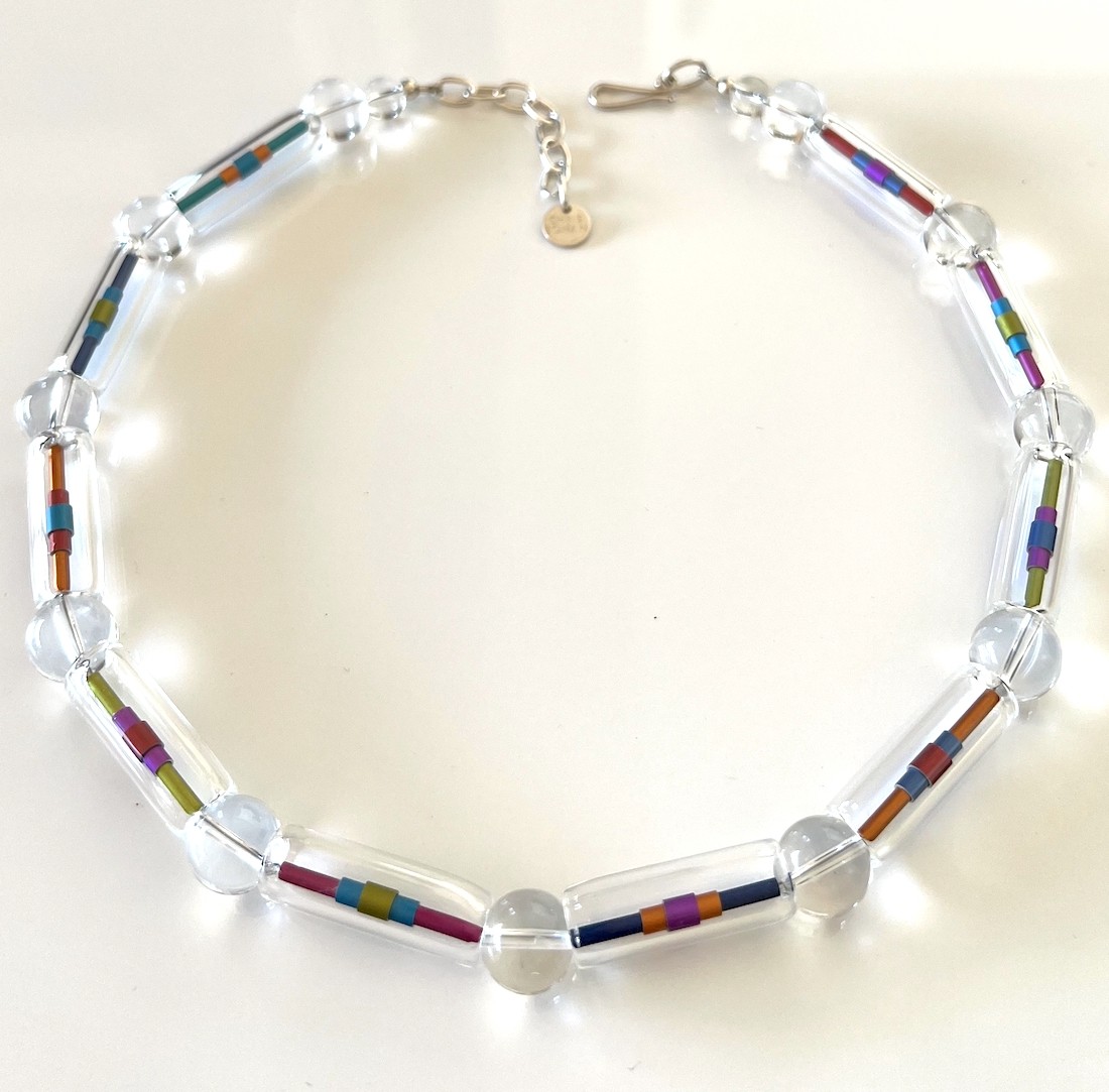 - Flameworked borosilicate glass tubes, anodised aluminium tubes, frosted quartz beads, sterling silver extension chain finished with a handmade clasp