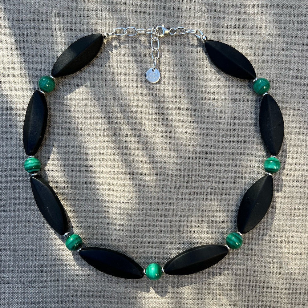 - Elements: sterling silver disks, extension chain and clasp, matt Blackstone and green malachite