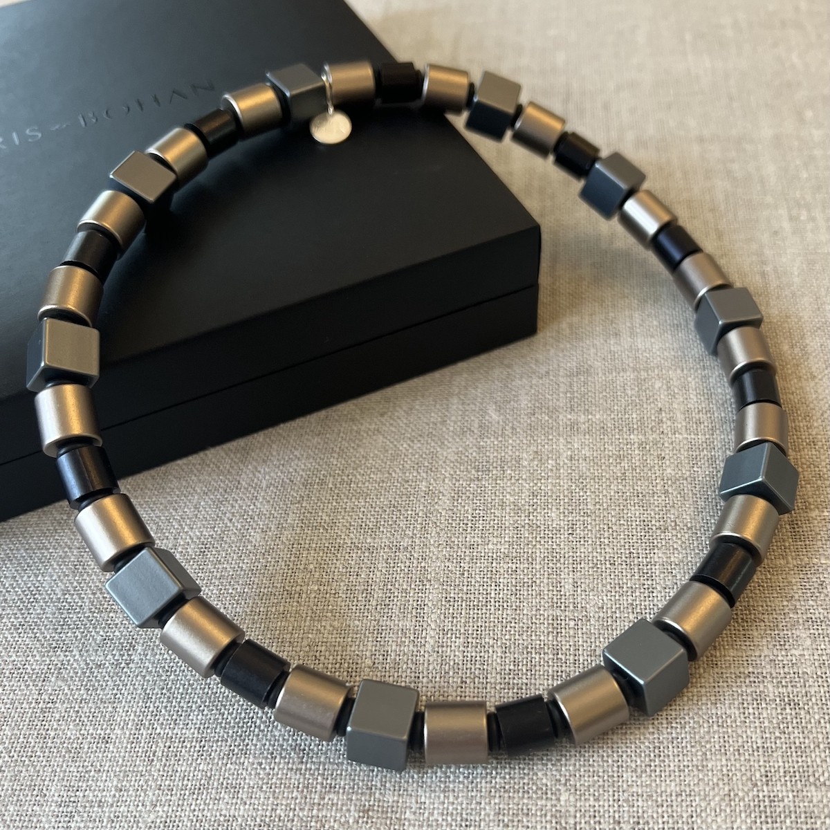 • Anodised aluminium cylinder and cube beads, magnetic clasp and sterling silver tag.