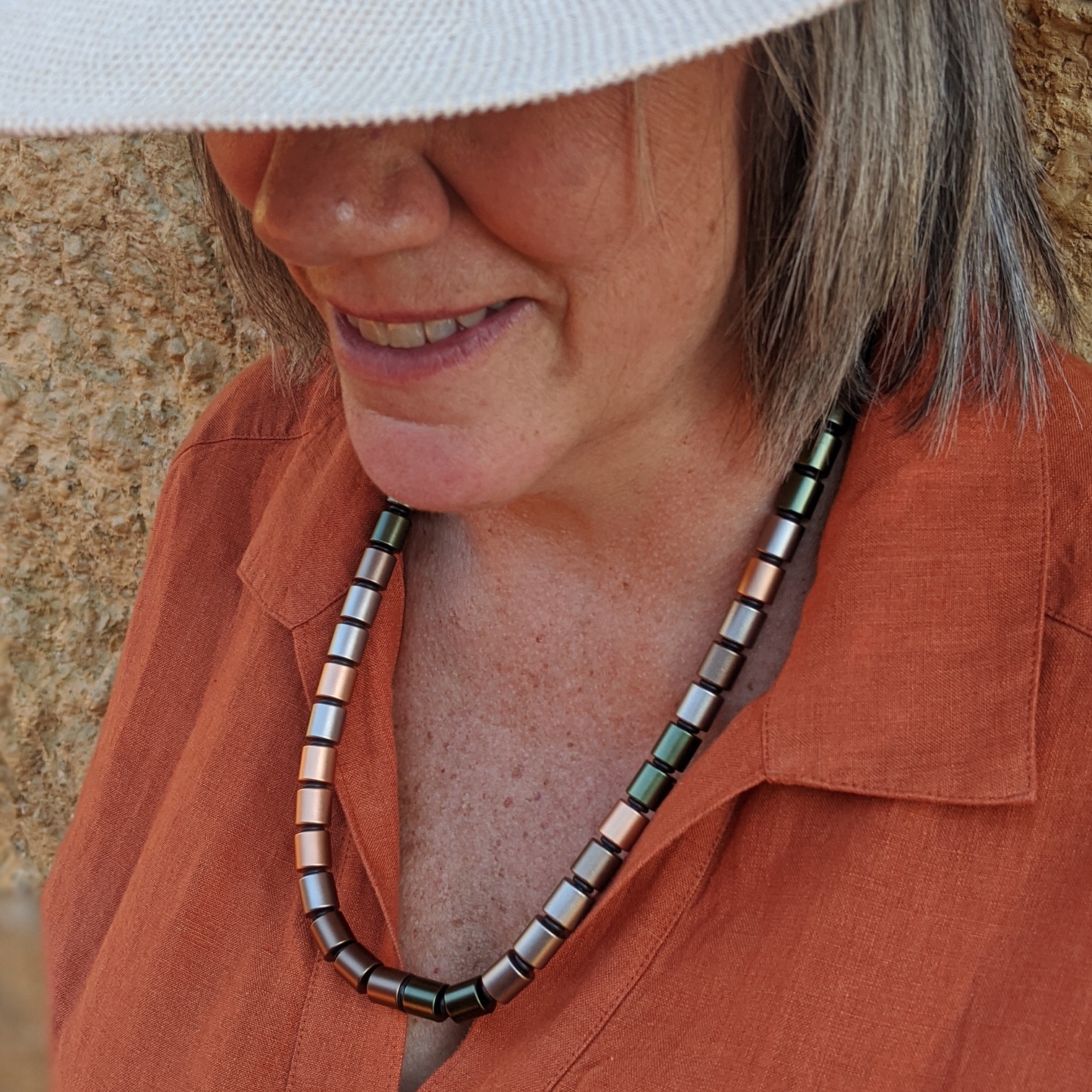 • Anodised aluminium beads, threaded on nitrile with black o-rings, super strong magnetic sterling silver clasp