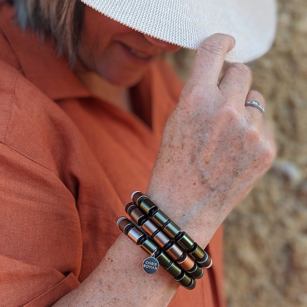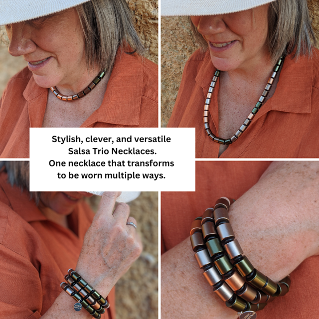 Your friends will be green with envy when you shimmy into the room wearing the Salsa Trio Edgy Olive necklace. Inspired by the fast-paced Latin dance, the Salsa, this versatile necklace can be worn in multiple ways. Wear this modern design as a bracelet or three, or as a necklace. If green is your favourite colour, you’ll love the Salsa Trio Edgy Olive necklace.