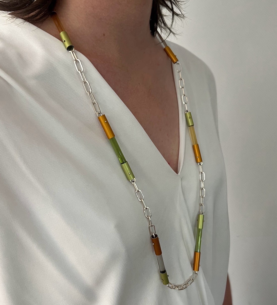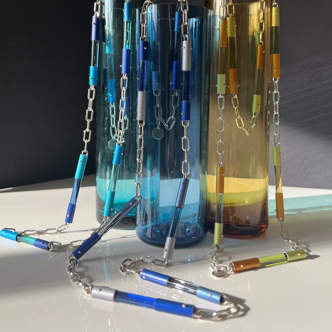 Introducing the Spritz necklace a long, elegant piece hand crafted with Italian square sterling silver cable chain combined with custom handmade components. Feature components incorporate transparent glass rods, capped with satin anodised aluminium creating a stunning contrast between the soft-coloured translucent glass and solid, vibrant end caps.