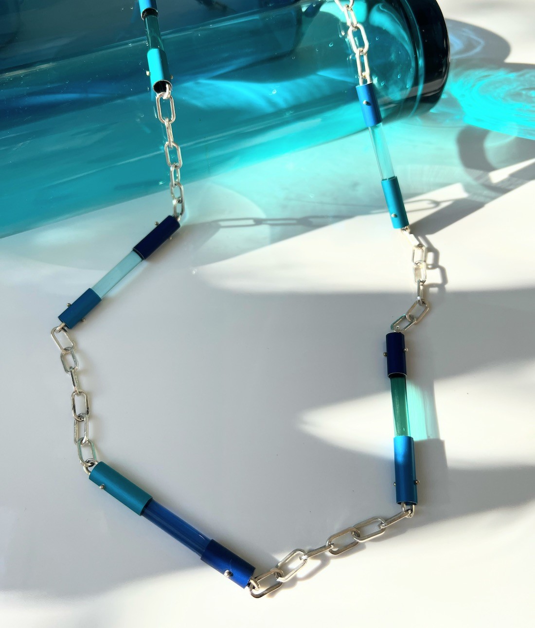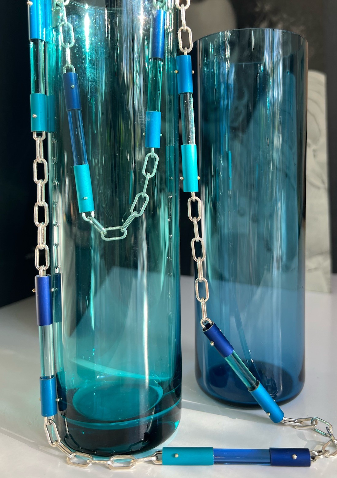 • Transparent glass rods, anodised aluminium, Italian sterling silver square cable chain